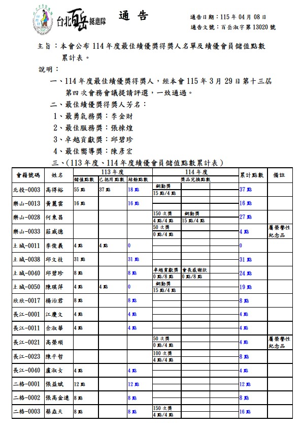 本會公布114年最佳績優獎得獎人名單及績優會員儲值點數