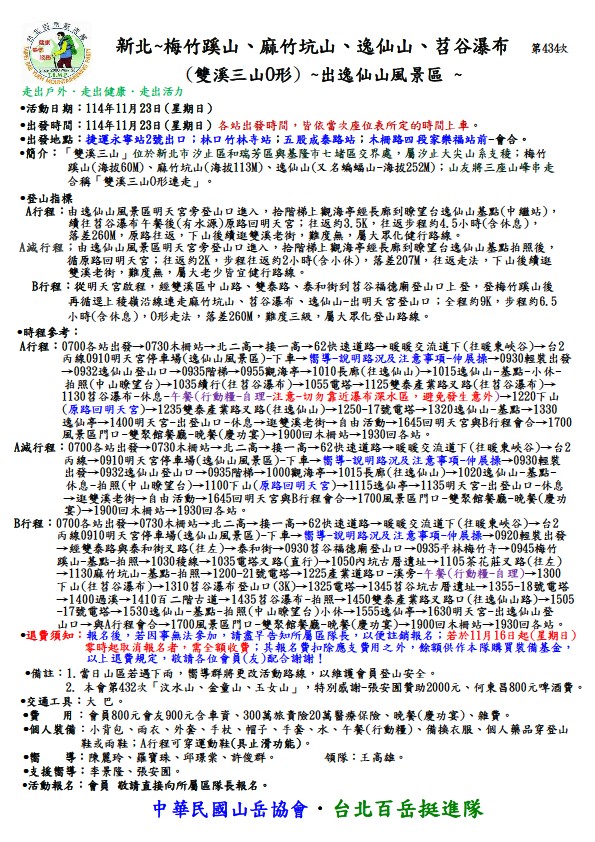 2025/11/23 第434 次活動行程 新北~雙溪梅竹蹊山、麻竹坑山