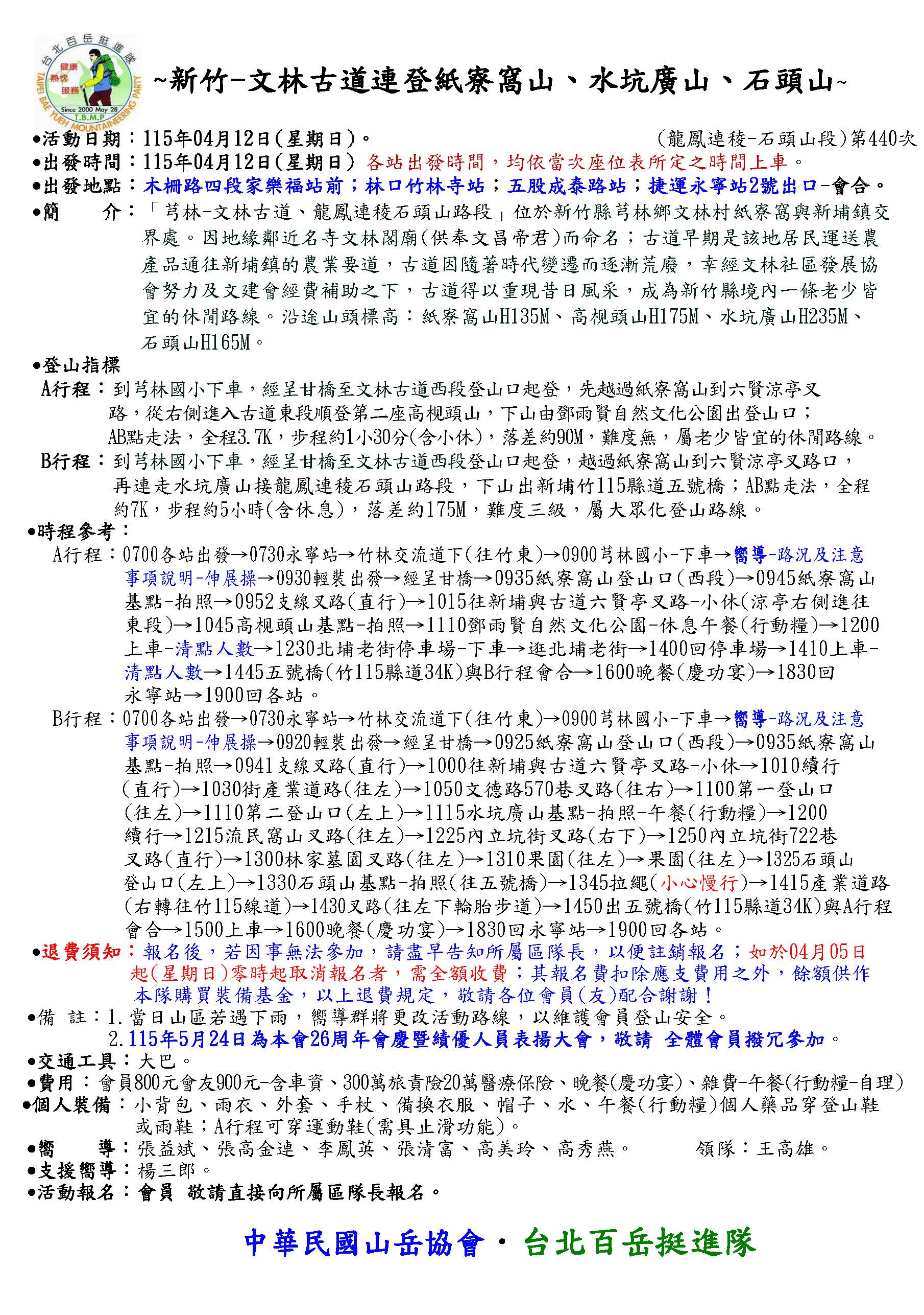 2026/04/12 第440次活動行程 新竹芎林文林古道連登、 紙寮窩山 、水坑廣山、石頭山